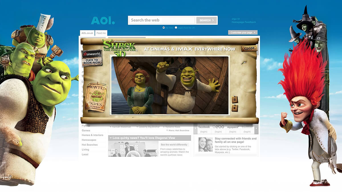 BRIEF - To support the release of Shrek: The Third, DreamWorks Pictures commissioned a playful digital asset kit centred around a high-impact homepage takeover. The creative needed to reflect the film’s signature humour and larger-than-life characters, with supporting banners and visual assets designed for use across key entertainment platforms. The primary focus was to deliver a bold, animated takeover experience that captured attention instantly and reintroduced audiences to the irreverent world of Shrek and friends.