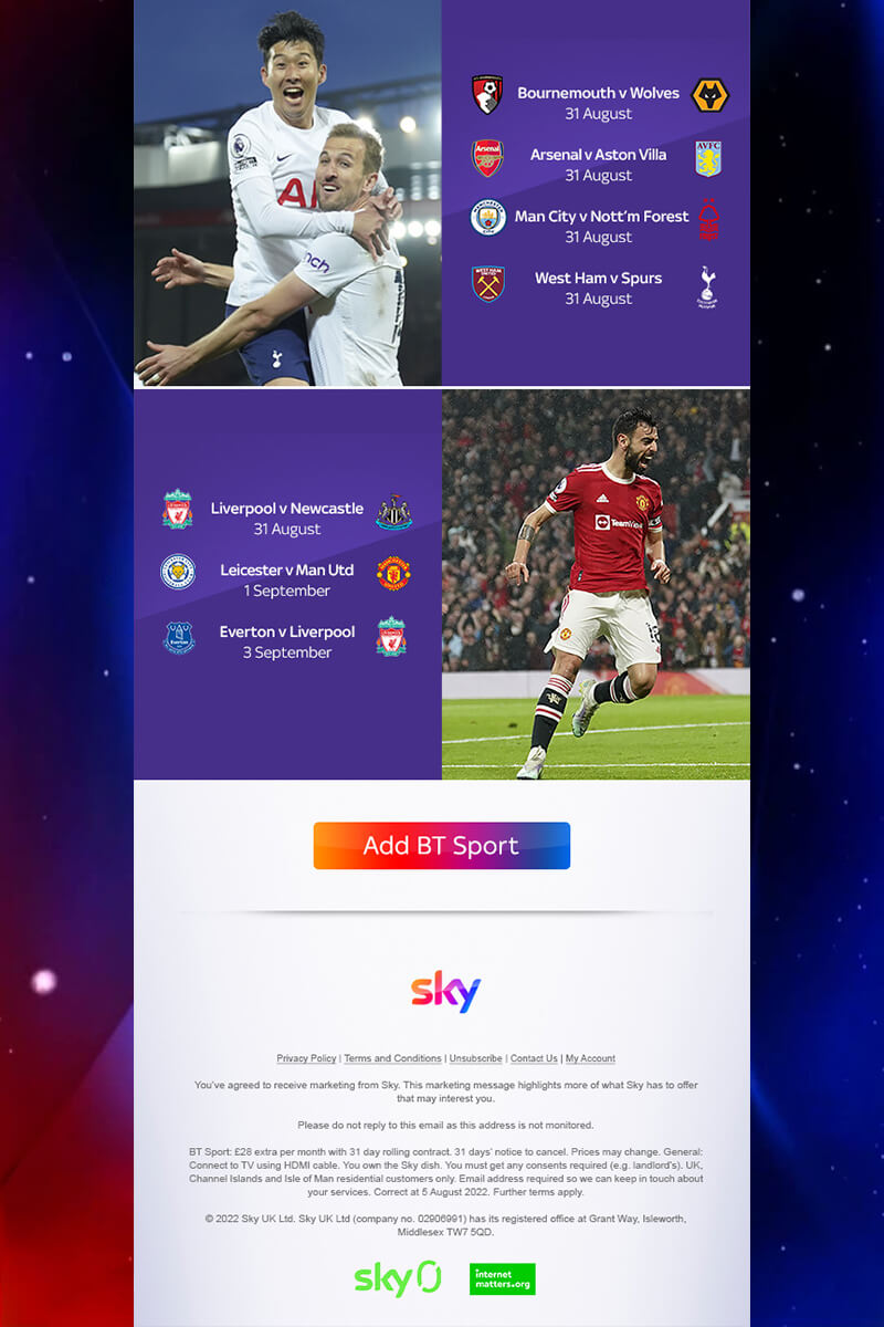 Working on Sky Sport's weekly marketing emails may not demand a full creative overhaul each time, but with over *10 million people receiving them*, every pixel and every update matters. These emails follow a tight, templated design! So while the layout stays largely the same, precision is everything. From updating match dates and kick-off times to swapping out players and reworking the copy, the challenge lies in getting it right fast, and fuss-free.